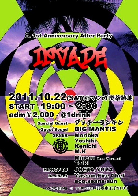 10.22(土)スケーターズナイトg. 1ST Anniversary After Party INVADE 泉州でスケーターズナイト開催します! 一夜限り、漫画喫茶の跡地を借りきって、スケボーセクションを設置! レゲエとヒップホップとスケボーのお祭りです 当日プロのスケーターも多数来ます メッセージ貰えたらゲスト取りますのでご連絡ください @貝塚市王子マンガ喫茶跡地(〒597-0051貝塚市王子910-1) MAP↓ http://www.chizumaru.com/maplink.asp?SER=all&D=all&X=487259.523&Y=123925.914&SCL=530 START19:00〜26:00 ADM:\2,000-1ドリンク付 Special Guest ブ