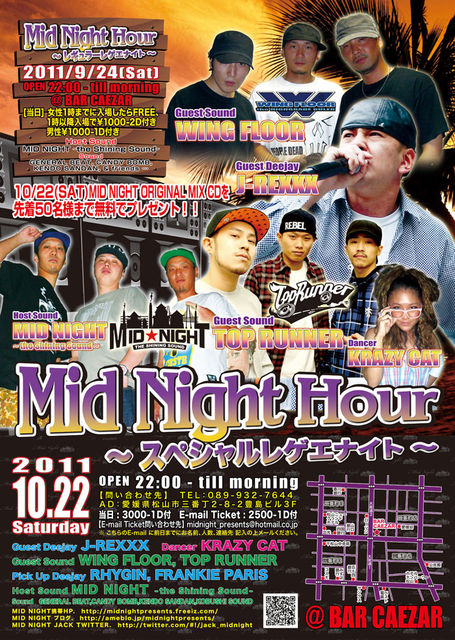 先着50名様にMID NIGHT ORGINAL MIX CD無料でプレゼント!! Mid Night Hour〜スペシャルレゲエナイト〜 2011/10/22(Sat) Open:22:00-till morning @BAR CAEZAR 愛媛県松山市三番町2-8-2豊島ビル3F 089-932-7644 当日:3000-1D付 E-mail Ticket:2500-1D付 E-mail Ticket問い合わせ先:midnight_presents@hotmail.co.jp こちらのE-mail に前日までにお名前、人数、連絡先記入の上メールください。 詳細 Guest Deejay:J-REXXX Guest Sound:WING FLOOR,TOP RUNNER Pick Up Deejay:RHYGIN,FRANKIE PARIS Dancer:KRAZY CAT