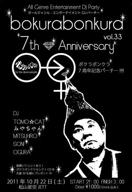10月22日(土) オールジャンル・エンターテイメントDJパーチー ボクラボンクラ Vol.33 7th anniversary 7周年記念パーチー!!!! 松山星空JETT START 21:00 FINISH 3:00 door\1000(1Drink込み) 先着30名様にボクラボンクラセレクトCDをプレゼント DJ ■TOMOCAT ■みやちゃん ■MITSUHIRO ■SONI ■OGURA ■MACUMBA イングリッシュティーチャー ■ALEX KAMINARI FATSさんは体調不良のため、出演できなくなりました。 2004年秋よりスタートしました、オールジャンル・エンターテイメントDJパーチー、 ボクラボンクラも