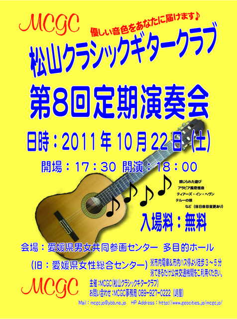 愛媛県男女共同参画センター 多目的ホール (松山市山越町450) 開場 17:30 開演 18:00 入場無料 主催:MCGC(松山クラシックギタークラブ http://www.geocities.jp/mcgcjp/) お問い合わせ:MCGC事務局 089-927-0222(嶋屋) mcgc.jp@ybb.ne.jp どうぞお気軽にお越しください
