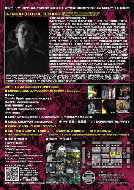 DJ NOBU (Future Terror)、松山登場! 『SPACEGRINDER×炸裂するキチガイの右脳』にて出演致します。 地下シーンから世界へ昇る、もはや我が国のフロアに欠かせない絶対無比の存在、DJ NOBUがついに降臨!!!! 当日は、D.I.Y.精神炸裂のぶっとびデコレーションで、音・空間ともに宇宙を創造します!!是非!! ■DRAKONIA 2011.10.22 (土) @音溶 ■Special Guest. DJ NOBU (FUTURE TERROR) →3hours set ★DJ NOBU (FUTURE TERROR) 千葉FUTURE TERROR主宰/DJ。DJに対するストイックな志、音楽への愛情、そしてパーテ