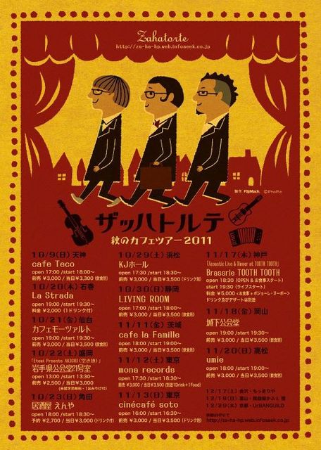 10/22(土) 『ザッハトルテ秋のみちのくカフェツアー』 会場 九十九草(中ノ橋通1-8-4) http://www.99gusa.com/ open 18:30 /start 19:00〜 料金. ¥2500-(お蕎麦代込・ドリンク代別) 30席限定 ★チケット★ メール予約:etawi_@hotmail.co.jp又は zahatorte@fujimach.com ※上記アドレスにご予約のお名前と枚数、連絡先を明記の上、送信してください。 主催・問合せ: Etawi http://etawi.jugem.jp 秋のカフェツアー詳細 特設ページ http://za-ha-hp.web.infoseek.co.jp/autumntour2011/
