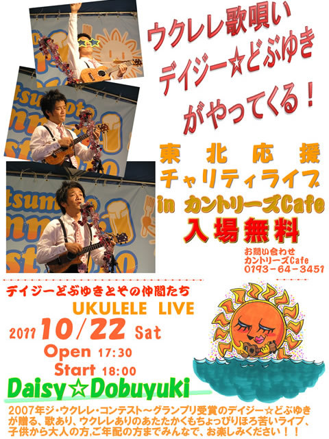 イベントのお知らせをさせていただきます。 10/22(土曜日) 〜ウクレレシンガー、デイジー☆どぶゆきが宮古にてライブ開催〜 ウクレレライブ 【デイジー☆どぶゆきと、その仲間たち】 2007年ジ・ウクレレ・コンテスト〜グランプリ受賞のデイジー☆どぶゆきが贈る、歌あり、ウクレレありのあたたかくもちょっぴりほろ苦いライブ。 子供から大人の方,ご年配の方までみんなで、お楽しみください!! ウクレレの音色で癒され デイジー☆どぶゆきのショータイムを お楽しみください。 会場:カントリーズカフェ 開場時間 17:30 /