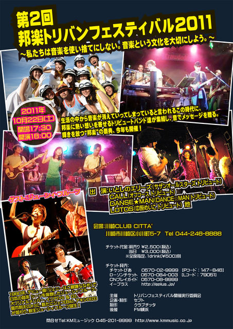 今年第2回開催となる「トリビュートバンドフェスティバル」に、 ジューシィがゲスト出演します。 皆さん、是非お越し下さい 〜第2回邦楽トリバンフェスティバル2011〜 日程:10月22日(土) 会場:川崎CLUB CITTA' http://clubcitta.co.jp/ 開場/開演:17:30/18:00 出演 いとしのエリーズ(サザンオールスターズトリビュート) CALL(オフコース」トリビュート) DANSE★MAN(DANCE☆MANトリビュート) LOTOS(中原めいこトリビュート) 他 ゲスト