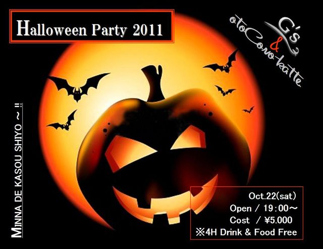 例によって・・・ とりあえず日程だけご連絡。 10月はハロウィーンパーティーだよ。 仮装してきてね。 で お隣さんの小粋なスポーツバー『G'z』さんとのコラボイベントですよ。 2軒飲み食い放題で弾けちゃっておくんなせい。 諸々、詳細は再度アップしますが日程だけ〜。