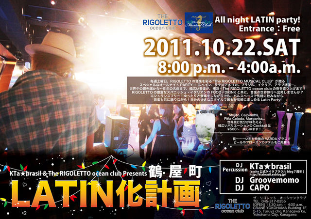 10/22(sat) 横浜西口 Rigoretto Ocean Club KTa☆Brasil presents 「Rigoretto Musical Club」 http://ktabrasil.exblog.jp/16437863/ 先月初登場のRIGOLETTO、 その際に主催のKTa☆Brasil氏と一晩中いろいろやりたいねー、 ということで意見が一致、今月はオールナイトでやります。 DJは3名、主催者KTa☆Brasil、還暦ダンディーDJ CAPO そして僕、CubanGroove momo 終電で帰る方も、終電で来ていただける方も大歓迎! 大型のレストラン/バルのBGM的DJですが、エントランスのウェイティングスペースではハイテーブルのまわりで自