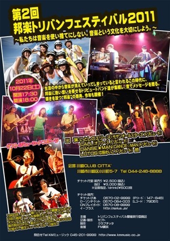 今年第2回開催となる「トリビュートバンドフェスティバル」に、 ジューシィがゲスト出演します。 皆さん、是非お越し下さい 〜第2回邦楽トリバンフェスティバル2011〜 日程:10月22日(土) 会場:川崎CLUB CITTA' http://clubcitta.co.jp/ 開場/開演:17:30/18:00 出演 いとしのエリーズ(サザンオールスターズトリビュート) CALL(オフコース」トリビュート) DANSE★MAN(DANCE☆MANトリビュート) LOTOS(中原めいこトリビュート) ゲスト ジューシィ・フルー