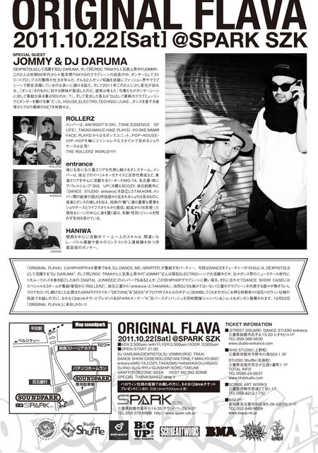 ¡ÖORIGINAL FLAVA¡× ¤È¤ÏHIPHOP¤Î4ÂçÍ×ÁǤǤ¢¤ë¡¢DJ¡¢DANCE¡¢MC¡¢GRAFFITI¡¢¤¬½¸·ë¤¹¤ë¥Ñ¡¼¥Æ¥£¡¼¡ª º£²ó¤Ïentrance¤Î¶¨ÎϤÇDANCE¤ò¥Õ¥å¡¼¥Á¥ã¡¼¡ª ¥²¥¹¥ÈDJ¤Ë¤Ï¡¢DEXPISTOLS¤È¤·¤Æ³èÌö¤¹¤ë"DJ DARUMA"¡¢¤½¤·¤ÆÆ±¤¸ROC TRAX¤«¤é¿Íµ¤µÞ¾å¾ºÃæ¤Î"JOMMY"¡ª ¸½ºßELECTRO¥·¡¼¥ó¤ÇÂç³èÌöÃæ¤À¤¬¡¢¸µ¡¹¥À¥ó¥¹³¦¤Î¥Ë¥å¡¼¥¹¥¯¡¼¥ëÀ¤Âå¤Ë£±Âç¥à¡¼¥Ö¥á¥ó¥È¤ò´¬¤µ¯¤³¤·¤¿¤¢¤Î¡ØDIGITAL JUNKEEZ¡Ù¤Î¥á¥ó¥Ð¡¼¤Ç¤¢¤ë£²¿Í¤¬¡¢¤³¤ÎÆüHIPHOP¥¯¥é¥Ö¥·¡¼¥ó¤ËÉñ¤¤Ìá¤ë¡£ ¤½¤ì¤Ë¹ç¤ï¤»¤ÆDANCE SHOW CASE¤Ë¤Ï¡Øentrance¡Ùtakaomi¤Î¸Æ¤Ó¤«¤±¤Ë¥¹¥Ú¥·¥ã¥ë¤Ê3¥Á¡¼¥à¤¬½¸·ë