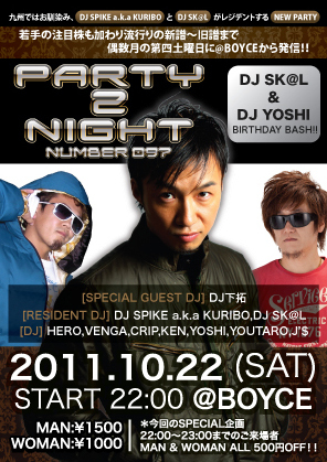 DJ SPIKE & DJ SK@L & DJ YOSHIのBirthday Bashってことで22:00~23:00までのご来場者 MAN & WOMAN ALL 500円OFF!!