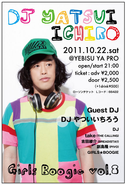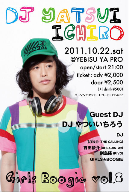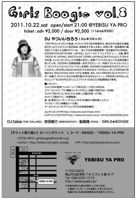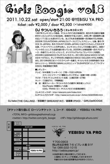 管理人様、告知失礼いたします。 今年の10月も岡山にやっつんがやって来る J-POP、J-ROCK、フェス好きのみなさまぜひ遊びに来てください GIRLS★BOOGIE vol.8 2011/10/22(sat) open/start 21:00 @YEBISU_YA_PRO http://yebisuyapro.jp/ チケット:adv¥2000(drink別\500) / door\2500(drink別\500) チケット取り扱い→YEBISU_YA_PRO ローソンチケット(Lコード→66422) GUEST DJ DJやついいちろう ビクターエンタテインメントによるDJやついいちろう(エレキコミック)公式サイト http:/