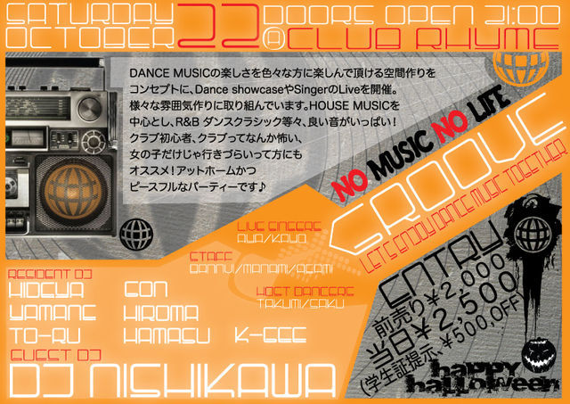 管理人様、いつもお世話になります。告知失礼いたします。 不適切なら削除願います。クラブイベントの告知です。 GROOVE!! Vol24詳細をUP!!! 今回は『GROOVE!!』記念すべき、第1回目にGUEST DJとして、お招きしたDJ NISHIKAWA氏 約3年ぶりに『GROOVE!!』登場!!!! DANCE MUSICを知り尽くした、 NISHIKAWA氏のPLAY聞き逃すべからず!!!! 岡山の重鎮のPLAY聞かずして、 岡山のクラブシーンは語れない!!!! 【GROOVE!!&THE LOUNGE】 PHOTO GALLERY (前回までのGROOVE!!とTHE LOUNGEの様子です。 ご自由にどうぞ♪) http://