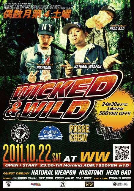 管理人様、告知失礼します。 偶数月第四土曜日開催! 『WICKED & WILD』!! 今回のゲストはこの3人だ!! 「泉州で最もアツイ男」ゲットープリンスこと【NATURAL WEAPON】がジャマイカ長期修行から帰国し、『WICKED & WILD』に初登場!!! そして、【ROAD TO レゲエ祭 2008】へ大阪代表として参加。その後、数々のディージェイ・クラッシュで優勝の実績を持つ【HISATOMI】!!! さらに、14才からマイクを握り、様々な現場を経験し、着実に腕を磨き、スキルを上げている。 新たな時代を担うであろう【HEA