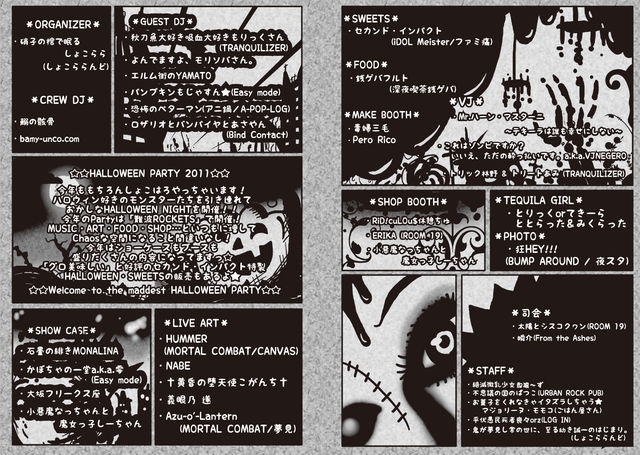 ★-★HALLOWEEN PARTY 2011★-★ 今年ももちろんしょこはろやっちゃいます! ハロウィン好きのモンスター達を引き連れて、おかしなHalloween Nightを開催!!! 今年のPartyは「難波ROCKETS」で開催! MUSIC,ART,FOOD,SHOP...と、いつもにも増してChaosな空間になること間違い無し!!! 今年はショーケースもブースも盛りだくさんの内容になってますっ 毎年大好評のMonster's Cafe、グロおいしいと定評のある「セカンド・インパクト」のHalloween特製SWEETSの販売もあるよ★ ★★★Welcome to the maddest Halloween Party★★★