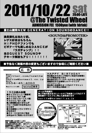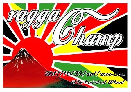 富士山麓発次世代SOUNDのDANCE!! 【ragga champ】 2011/10/22/sat 20:00-LATE @都留ツイステッドホイール http://mixi.jp/view_community.pl?id=220942 1500円(1DRINK付) 満員御礼は当たり前!! レゲエ好きはもちろん HIPHOPファンもビギナーも 楽しめるDANCEが ラガ・チャンプ!! 当日ゲストSOUNDやテキーラ解放もあり!! SOUND&PROMOTER ragga champ from頑者