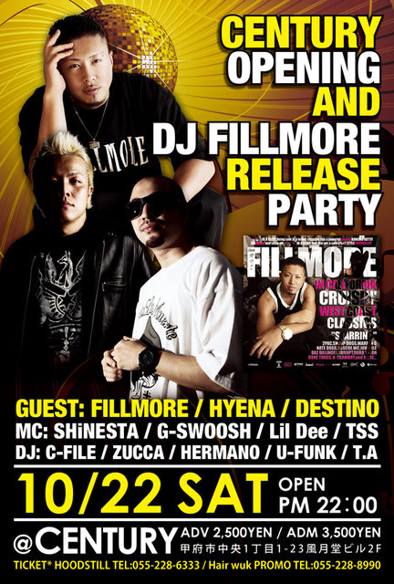 急遽開催 ◆DJ FILLMORE RELEASE&CENTURY OPENING◆ 10月22日土曜日 OPEN 22:00〜 ADV¥2500 ADM¥3500 @CENTURY (甲府市中央1丁目1-23 風月堂ビル2F) ◆GUEST DJ FILLMORE HYENA DESTINO ◇DJ C-FILE HERMANO ZUCCA T.A U-FUNK ◇MC SHiNESTA G-SWOOSH Lii Dee TSS ★チケットインフォ★ HOODSTILL 055-228-6333