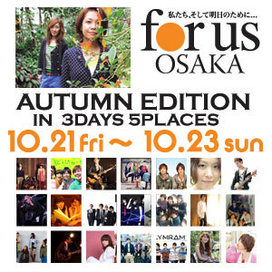 10/23(日)梅田 amHALL 【For us OSAKA 〜AUTUMN EDITION IN 3DAYS 5PLACES〜】 (出演)WADAYA-和田家-/ultima!!/浅野昇二/jungle mic/Cooley High Harmony/初田悦子/ツキノスミカ/花*花(GUEST) (時間)開場15:00/開演15:30  危険・警告浅野昇二の出演は16:50〜17:20予定です危険・警告  ぴかぴか(新しい)サポート:山本義則(Don君)ぴかぴか(新しい) (Ticket)前売¥2,800 当日¥3,300(別途1Drink代¥500要)  ※収益の1部を東日本大震災義援金として寄付させて頂きます。 (住所)大阪市北区曽根崎2-14-17 CIビル3階 (TEL)06-6362-2001 (Web site)http://amhall.j
