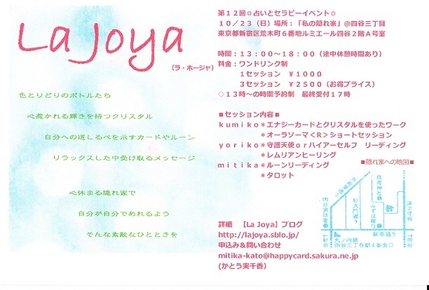はじめましてかとう実千香と申します。 10月23日(日)に定期的に【La Joya】というグループで活動している *占いとセラピー*のイベントを四谷三丁目「私の隠れ家」さんにて開催します! オーラソーマ<R>ショートセッション他、 一度に数種類のセッションを体験できるこの機会に ぜひぜひこれからの自分のテーマや方向性を掴みにいらしてください♪ セッションの内容リンク付告知は 「ラホブロ」へ http://lajoya.sblo.jp/ *** 【La Joya】(ラ・ホージャ) 第12回◎占いとセラピーイベント◎ 日付:10/23(日) 場