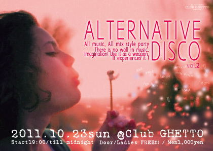☆☆☆ALL MUSIC ALL MIX PARTY☆☆☆ 『 ALTERNATIVE DISCO vol.2 』 ◆2011年10月23日(日) ◆@club GHETTO ◆Open19:00/till midnight ◆Door/Ladies FREE !!!/Men 1,000yen ■□■□関西発オールミックスパーティー『オルタナディスコ』 あらゆる音楽を渾然一体に質の良いダンスミュージックとして機能させ、 わかりやすさとクオリティーを追求した誰でも楽しめるパーティーです★ ガガもリアーナもビヨンセも、ゲッタにピットブルも、 ボブサンクラーにレイドバックルークにLMFAOも、 それにレッカにミンミにm