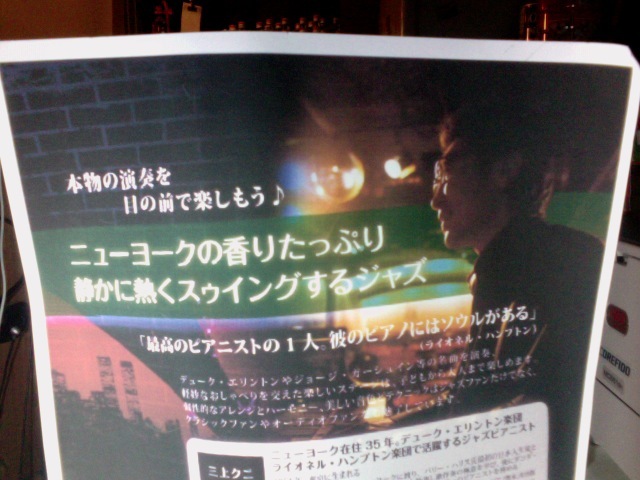 2011.10.23(日) 開場 17:00 開演 17:30 3,000円(1ドリンク付き)+(無料軽夕食付き) 三上クニ(ピアノ)http://www16.big.or.jp/~we3trio/ 池田聡(ベース)http://www.satoshi.net/ 井川晃(ドラム)http://jazznoyakata.jp/musi/drum/igawa_akira/igawa_akira.html