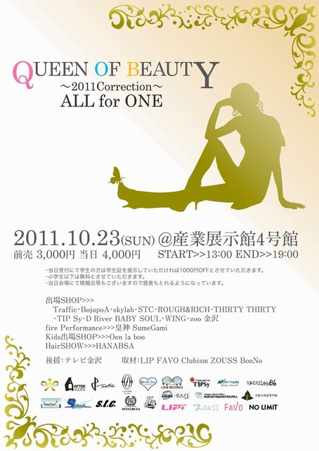 失礼します。 Queen of beauty2011correction 10月23日(日) 場所:産業展示館4号館 時間:13:00〜19:00 チケット:前売り3000円 当日4000円 後援&取材 ・テレビ金沢 ・北国新聞 ・LIP ・FAVO ・Clubism ・ZOUSS ・BonNo チケット取り扱 ・DOUBLE     076-222-8333 ・LANGS        076-264-4334 ・Funy Story     076-220-1708 ・Traffic         0761-48-5455 ・BojupoA       0761-76-5233 ・skylab         0761-21-0510 ・STC