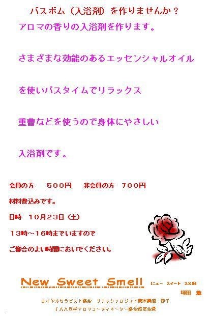 エッセンシャルオイルや重曹などを使って身体に優しい入浴剤を作ります。 アロマの香りの入浴剤を使って、普段の子育ての疲れを取って、心身ともにリフレッシュして下さい。 材料費込みで、会員の方:500円です。