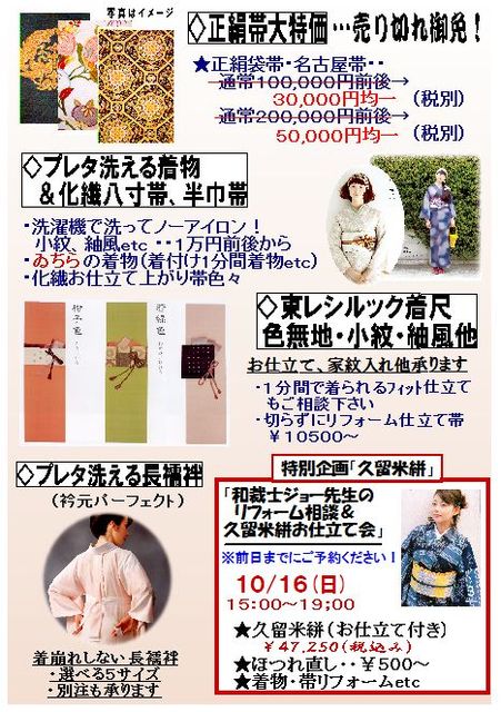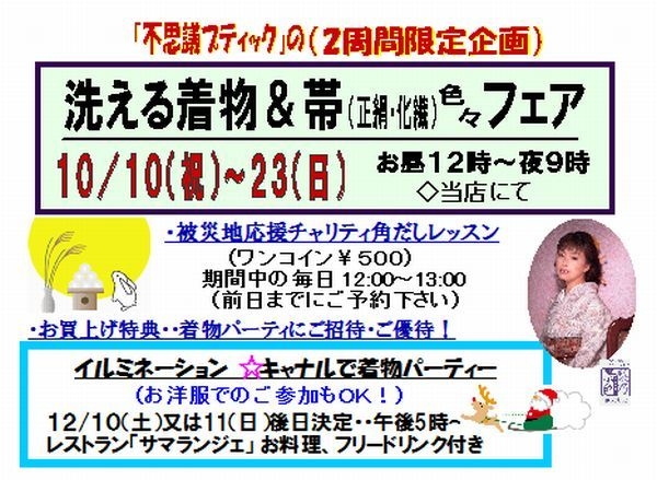 管理人様 告知お邪魔いたします 10月16日の「和裁士ジョー先生の一日リフォーム相談会」は終了致しました。 初企画「久留米絣お仕立て受注会」は23日まで続行致します ジョー先生のお仕立て付き47250円 貴女サイズで久留米絣の着物を作ってみられませんか? 可愛いドット柄や珍しい薔薇柄等20反程ラインアップしてます 引き続き「チャリティワンコイン角出しレッスン」は予約受け付けてます 被災地応援の思いと洗える着物フェア7周年の感謝込めて