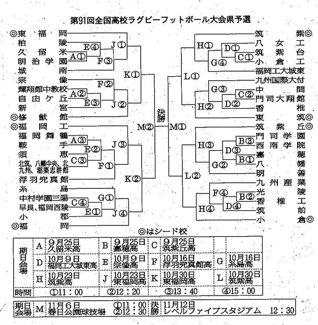 いよいよ花園をかけた戦いが始まります! 我が筑紫高校はシード校なので、 初戦 10月23日 筑紫高校 2戦目 10月30日 筑紫高校 準決勝 11月 6日 春日公園球技場 決勝 11月12日 レベルファイブ となります。 筑紫高校での戦いは、是非応援に! なつかしの母校訪問も兼ねて!