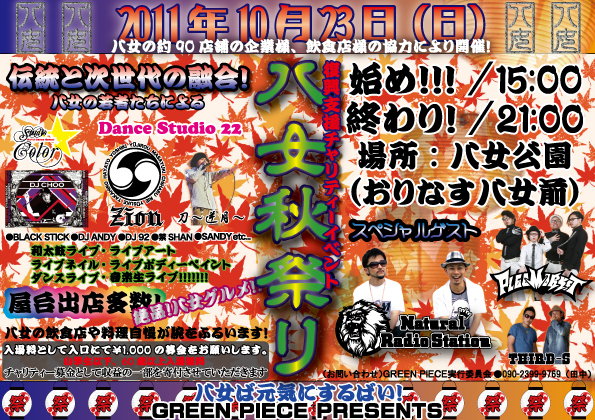 福岡は八女市で開催! その名も「八女秋祭り」 会場:八女公園(おりなす八女 前) 福岡県八女市本町569-1 八女の約90店舗の企業様、飲食店様の協力により開催! 15:00 〜 21:00 *FLEA MARKETsの出演は20:00〜 【八女秋祭り】 入場料:1000円 (前売り券はありません) 小学生以下60歳以上入場無料 ■出演 Natural Radio Station FLEA MARKET DJ CHOO and more 和太鼓ライブ ライブアート ライブネイル ライブオディペイント ダンスライブ 音楽生ライブ