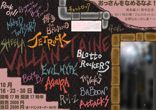 2011年10月23日(日) おっさんをなめるなよ!博多編21周年記念 〜2011秋の陣!フルスロットル!全開なおっさん達!!〜 @LiveSpace ZERO [出演] VALLAN-TAINE チョットロック ROCK ON! Dynamite Monster Boogie Train RUI-Z(鹿児島) ダンディーなゲスト有(長崎) オープン17:00 スタート17:30 前売¥2,000 当日¥2,500 (1drink別途¥500) チケット完売しました 当日券は発行致しません
