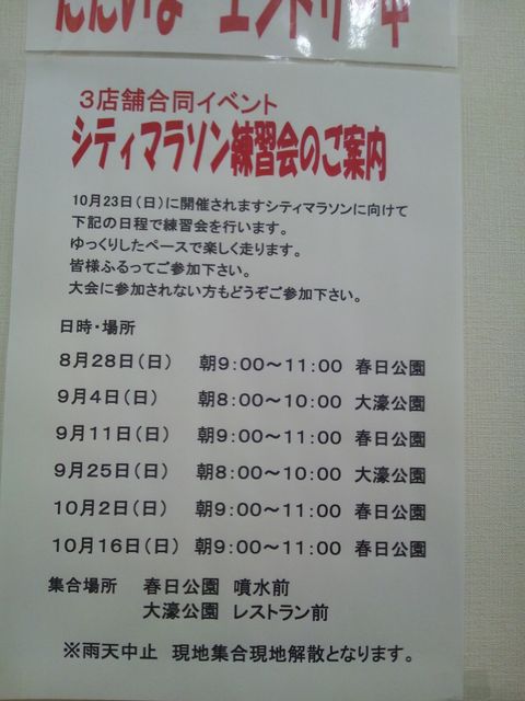 練習会の出欠などに使って頂ければと思います!! シティマラソン練習会 8/28 (日)9:00〜11:00 春日公園 9/04 (日)8:00〜10:00 大濠公園 9/11 (日)9:00〜11:00 春日公園 9/25 (日)8:00〜10:00 大濠公園 10/2 (日)9:00〜11:00 春日公園 10/16(日)9:00〜11:00 春日公園 ※(大濠リレーマラソン) 10/23 (日)シティマラソン本番 <集合場所> 春日公園ー噴水前 大濠公園ーレストラン前