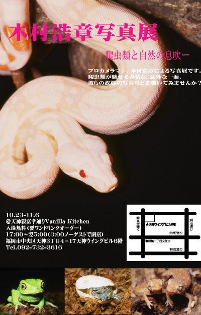 九州レプタイルフェスタ事務局の永井です。 僕のお店、バニラキッチンで、 プロカメラマン、木村浩章氏の写真展を開きます。 氏が取り貯めた写真の中から、 ベストショットを集めた写真展となります。 爬虫類の写真を中心に、 現地の自然の風景なども展示いたします。 ぜひぜひご来場くださいませ。 木村浩章写真展 −爬虫類と自然の息吹− 10月23日(日)〜11月6日(日) 入場無料(要ワンドリンク) 会場 天神親富考通り Vanilla Kitchen http://vanilla-kitchen.com/ 福岡市中央区天神3丁目4−17 天神ウイング1ビ