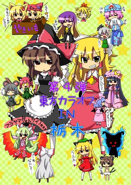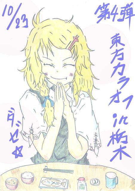 ↓携帯で見る人用 http://mixi.jp/view_diary.pl?id=1782158875&owner_id=31148203 ついに10月に変わり 食欲の秋・運動の秋・文化の秋と 秋姉妹が活躍する季節になりました!! =ω=)<お芋オフしたいね ・∀・)<カラオケで合唱 大会や! =∀=)<最終鬼畜全部でも? 大丈夫か? ・∀・)<大丈夫だ。問題ない。 前ぶりごめんなさい。 (しょぼ太) 東方が大好きな栃木の皆さん。 長らくお待たせしました。 今月も東方カラオケ開催いたします。 前回の例大祭SP前