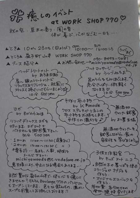 季節はすっかり秋ですね。 秋と言えば、またこのイベントの時期となりました。 癒しのイベントvol.4 at Work shop770♪ とき:10月23日(日) 10:00〜16:00ごろ ところ:益子町山本 Workshop770 お問い合わせ:うっづ・みちよ 090-8493−7081 michiyowoods@t.vodafone.ne.jp 秋の空・草木の香り・風の音・身体が喜ぶ心がなごむ一日を・・・♪ ☆ヘッドトリートメント byあろま日和 肩〜頭のトリートメントで、リラックス&リフレッシュ。 秋風にストレスも持って行ってもらいましょう☆10分500円 ☆フットマッサ