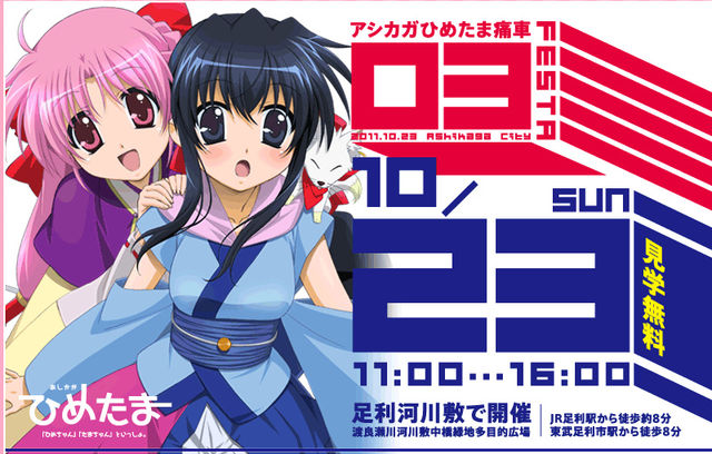 足利痛車フェスタ03イベントです。 http://www.himetama.jp/itafes.html まだ申し込みできるようなので大丈夫だと思います。 同日に痛コンやらACGやらこれぱやらがあってメンバーがバラけますが、各自盛り上がっちゃいましょう! ちなみに足利痛車フェスタは前日搬入ですので前回同様前夜祭ヤッちゃおうかと思います! 4日18時搬入ですので、その前辺りに近場の 食彩館マルシェ足利店 栃木県足利市山川町766-1 こちらで集合して買出しをしたいと思います。 参加される方はお早めにお願いします〜!