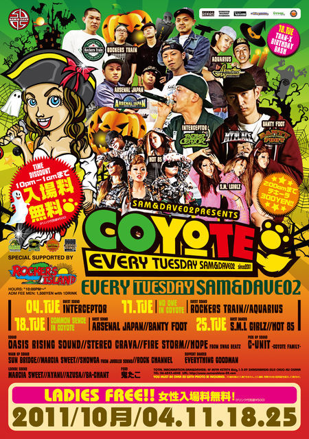 火曜日大阪ミナミでレゲエと言えばコヨーテ!! ↓COYOTEコミュニティ↓ http://mixi.jp/view_community.pl?id=1419958 コミュニティ550人突破 毎週火曜日、大阪はSAM&DAVE02の夜を騒がす BIG REGGAE DANCEHALL!!! COYOTE ※おかげさまで10周年目突入※ ↓COYOTE 公式BLOG↓ http://ameblo.jp/coyote06/ ↑ !!アクセス!! ↑ ※10月から@Sam&Dave2の 2nd Floorが解放になりました! LOUNGE PLAYはfrom HONEY JAM CREWが朝までロングプレイ! - HONEY JAM CREW - MARCIA SWEET / AYANI / AZUS