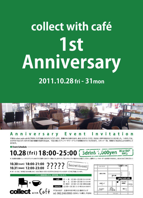 ¤¤¤Ä¤âcollect wait cafe¤Î¤´ÍøÍÑ À¿¤ËͤêÆñ¤¦¸æºÂ¤¤¤Þ¤¹¡£ ¤³¤ÎÅÙ¡¢10·î31Æü¤Çcollect with cafe ¤È¤·¤Æ ²¿¤È¤«1¼þǯ¤ò·Þ¤¨¤ë»ö¤¬½ÐÍ褽¤¦¤Ç¤¹¡£ ¤³¤ì¤â¤´ÍèŹĺ¤¤¤¿Êý¡¹¡¢±þ±ç¡¢·ãÎ夷¤Æ²¼¤µ¤Ã¤¿³§ÍͤΠ¤ª±¢¤À¤È»×¤Ã¤Æ¤ª¤ê¤Þ¤¹ ¤½¤³¤Ç¥¤¥Ù¥ó¥È¤È¸À¤¦Äø¤Î»ö¤Ç¤Ï̵¤¤¤Î¤Ç¤¹¤¬ 10·î28Æü¡Á31Æü¤Ë¤«¤±´¶¼Õ¤Îµ¤»ý¤Á¤ò¹þ¤á´ë²è¤òΩ¤Æ¤Þ¤·¤¿¡£ ´ë²è¤ÎÊý¤Ç¤¹¤¬ ------------------------------------------ 10·î28Æü¡Ê¶â¡Ë18»þ¡Á25»þ 3¥É¥ê¥ó¥¯1000±ß¡ÊÅöʰû¤ßÊüÂê¥á¥Ë¥å¡¼¤è¤ê¡Ë¤Ë¤ÆÄ󶡤µ¤»¤ÆÄº¤¤Þ¤¹¡£ ¤ª¤Ä¤Þ¤ß°Ì¤Ï½Ð¤·¤Þ¤¹