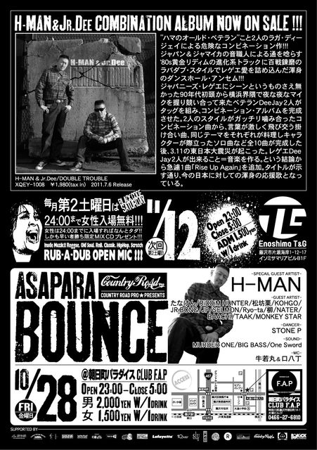 管理人様、告知失礼致します。 朝日町パラダイス @CLUB F.A.P 神奈川県藤沢市朝日町14-1犬塚ビル2F 11pm-5am 男¥2000−1d 女¥1500−1d mixi見たで¥500−OFF [SPECIAL GUEST ARTIST] H-MAN [GUEST ARTIST] たなけん RIDDIM HUNTER 松坊栗 KOHGO JR.BONG JP SELMON RYO-TA 柳 NATER BAACHI TAAK MONKEY STAR [GUETS SOUND] MURDER ONE BIG BASS ONE SWORD [DANCER] STONE P [MC] 口八丁/牛若丸