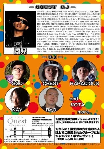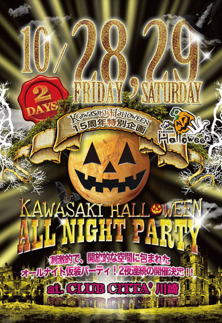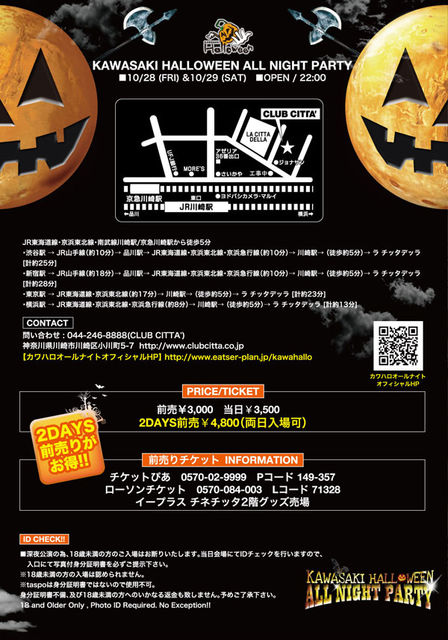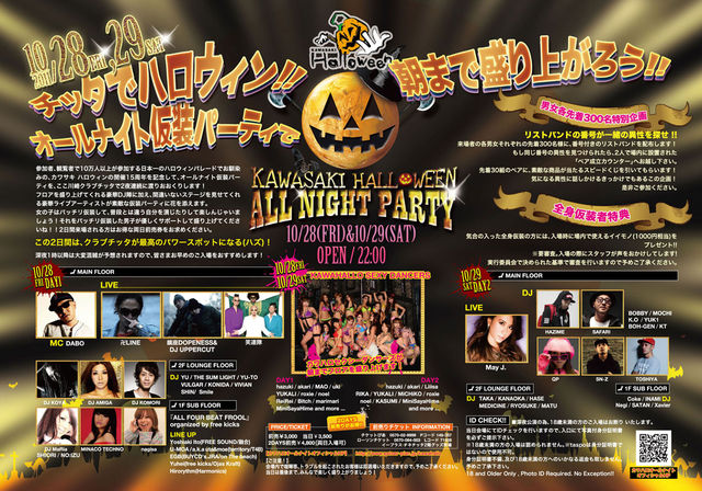 今年も川崎ハロウィンPARTY開催の時が迫ってまいりました!豪華アーティストが川崎の夜を盛り上げます!!Sanctuaryによる空間演出も見物です!discountご希望の方全員のフルネームをご明記の上メッセージ下さい!よろしくお願いします。 Kawasaki Halloween2011 KAWASAKI HALLOWEEN ALL NIGHT PARTY 2DAYS 【MAIN FLOOR】 MC:DABO a.k.a. Mr.Fudatzkee LIVE: 卍LINE/鎮座DOPENESS&DJ UPPERCUT/笑連隊 DJ: KOYA/AMIGA/KOMORI/MaRia/MINACO TECHNO/SHIORI/ nagisa/NO:IZU KAWAHALLO SEXY DANCERS:azuki/akari/MAO/uki/YUKALI/ roxie/noel/