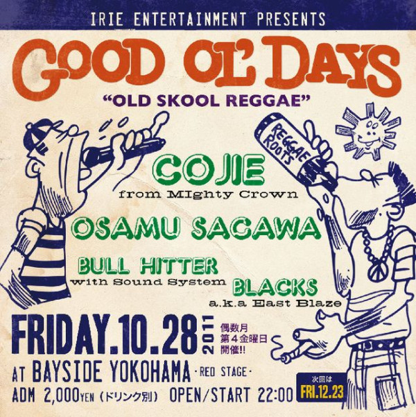 管理人様、告知失礼します。 不適切でしたら、削除お願いします。 -IRIE ENTERTAINMENT PRESENTS- 「GOOD OL' DAYS」 "OLD SKOOL REGGAE" 出演 ・COJIE(MIGHTY CROWN) ・佐川 修 ・BULL HITTER with SOUND SYSTEM ・BLACKS a.k.a East Blaze 開催日時 2011年10月28日(金) 22:00開場/開演 会場 BAYSIDE YOKOHAMA -RED STAGE- 神奈川県横浜市中区新山下3−4−19 045−350−8089 入場料金 ¥2,000 (ドリンク別) 20歳未