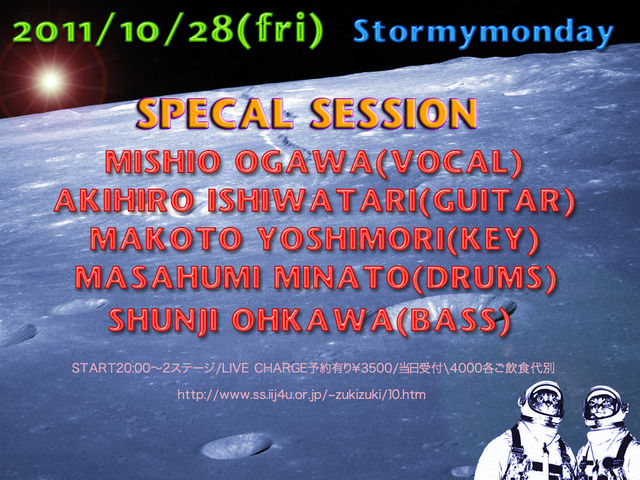 美潮スペシャルセッション! 小川美潮(Vo) 石渡明廣(G) 大川俊司(B) 吉森信(Key) 湊雅史(Ds) START20:00〜2ステージ LIVE CHARGE予約有り¥3500/当日受付\4000各ご飲食代別 http://www.ss.iij4u.or.jp/~zukizuki/ ストーミーマンデイ横浜 045-664-2085