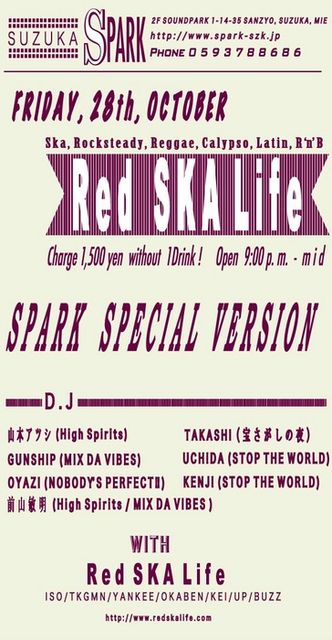 鈴鹿のSPARKで開催する今回のRed SKA Lifeは、SOUNDPARKビル(http://www.soundpark2008.jp/index.html)でのSPARK最終月ということもあり、特別バージョンとして三重県内のSPARKにまつわるイベントで活躍するDJの方々をお迎えして開催します。