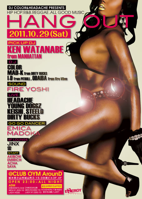 DJ COLOR&HEADACHEが送る死角なしのNEW BIG PARTY 『Hang Out』!!!出演者は各地をロックしてるPLAYERが一挙集合!!間違いなく激熱なLIVE陣に多彩な選曲で踊らすDJ陣!!PICK UP DJには、埼玉、都内を中心に活躍するFrom ManhattanからDJ KEN WATANABE!BIG PARTYですから華がなきゃ始まらない…。そんなあなた!!ご安心下さい。SEXYなGO GO DANCER達に、STAFFは全員可愛い女の子なんてどおでしょうか?w もちろん、振る舞い酒も大量にご用意しております。うこんの力を飲んでからのご入場をお薦めしますw 料金設定