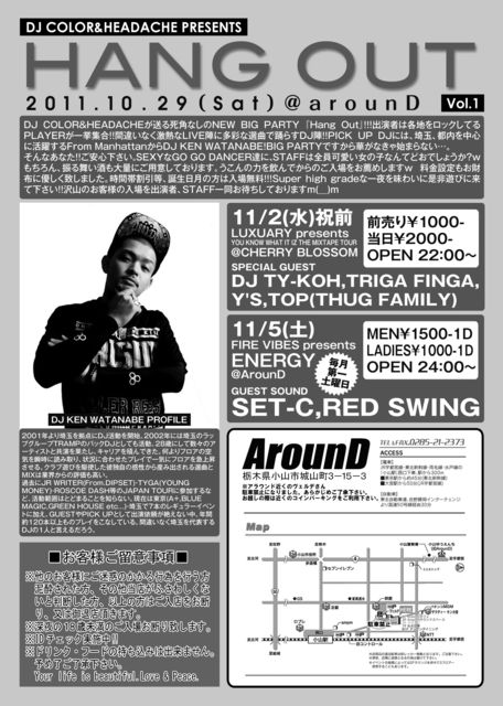 DJ COLOR&HEADACHEが送る死角なしのNEW BIG PARTY 『Hang Out』!!!出演者は各地をロックしてるPLAYERが一挙集合!!間違いなく激熱なLIVE陣に多彩な選曲で踊らすDJ陣!!PICK UP DJには、埼玉、都内を中心に活躍するFrom ManhattanからDJ KEN WATANABE!BIG PARTYですから華がなきゃ始まらない…。そんなあなた!!ご安心下さい。SEXYなGO GO DANCER達に、STAFFは全員可愛い女の子なんてどおでしょうか?w もちろん、振る舞い酒も大量にご用意しております。うこんの力を飲んでからのご入場をお薦めしますw 料金設定もお財布に優しく致しました。