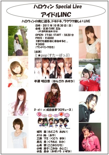 まぁみんが「ハロウィン Special Live」に出演します〜(^O^)/ 【ライブのご案内&チケット申込】 ■2011年10月30日(日) ■場所:芝浦 Studio Cube 326 住所:東京都港区海岸3-2-6(海岸通り沿いです) 地図:http://www.studiocube326.com/map.html 詳細地図:http://enjoy-live.net/detail/detail.php?hall_id=1216 ■open 17:50 start 18:20 Close 21:00 ■チケット代:4000円(ワンドリンク込) ■出演者:ミ★pop、半澤明日香、D-sis☆s、城所葵、AYA-絢
