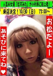 10/30(日)西新宿翔壱書店(http://www.shoichi-s.jp/ )xBOOK-R企画 第1部:「AVハードコア不法集会 松すみれとあそぼうぜ!」 小村井に人気AV女優 「松すみれ」が来店!! 2009年9月にAVデビュー。95cm・Iカップの爆乳ながら、58cmのウエストというプロポーションが特徴である。 http://blog.livedoor.jp/sunrisesumire/ 人妻からイカしたギャルまで幅広く活動している グラマスガール・松すみれさんが緊急参戦!っていうか もはやこれがメインです(笑) 場所:小村井BOOK-R