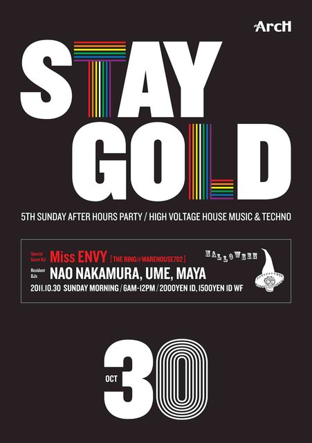 管理人様、告知スペースお借り致します。 5th SUNDAY AFTERHOURS PARTY STAY GOLD 新宿二丁目 ArcH 10月30日(日) AM6:00 - PM12:00 2000/1D W/F 1500/1D SPECIAL GUEST DJ Miss ENVY (The RING) RESIDENT DJ 中村直,UME,maya POLE DANCERS 37☆ てんてん 仕事もあるし朝帰りはキツイ...