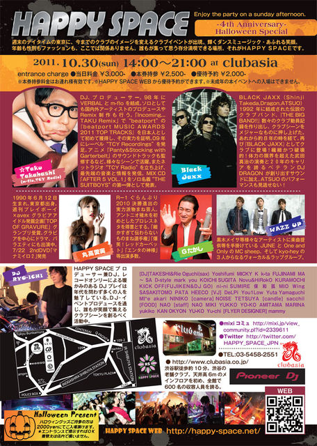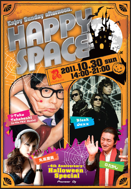 今までのクラブのイメージを変える新しいクラブイベントを 【HAPPY SPACE】-4th anniversary- halloween special デイタイムの渋谷で開催。しかも4周年&ハロウィンパーティー m-floのDJ☆Taku Takahashiさんや、俳優の武田真治さんがSAXをプレイするBlackJa