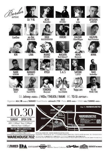 ☆★今夜!DJ下拓や豪華DANCER多数出演!10/30 BORDER@麻布十番WAREHOUSE702★☆ 今夜麻布十番WAREHOUSE702にて、日曜の麻布十番とは思えない豪華なイベントが開催されます メッセージ頂ければゲストお取りできます 東京、大阪で大活躍中のDJ下拓をGUESTに迎え、DANCERはメジャーアーティストのバックダンサーなどでも有名な豪華ダンサー陣が多数出演 ダンサー好きは必見です 30th Anniversary 【BORDER】 2011.10.30(SUN) OPEN 23:00 @ WAREHOUSE702 ■FEE ADV ¥1,500/Door ¥2,500