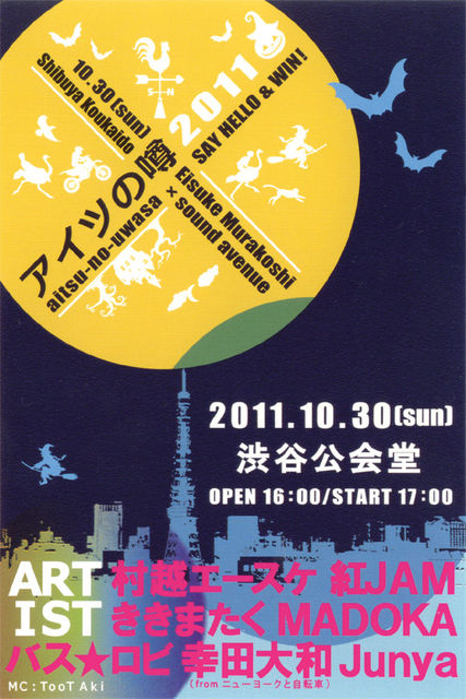 ◆◆2011年10月30日(日)◆◆ 村越エースケ×sound avenue Presents『アイツの噂』 【会場】[渋谷] C.C.Lemonホール [住所]東京都渋谷区宇田川町1-1 (tel:03-3463-3022) 【時間】OPEN 16:00 / START 17:00 【出演】村越エースケ/ 紅ジャム/ ききまたく/ MADOKA / バス★ロビ/ 幸田大和 / Junya 【MADOKA&サポートメンバー】 Guitar. KENTARO(from Gargoyle,宿イラズ,SIDE GOLD) Bass. リウ(from メトロノーム / ADAPTER。 / ケラ&ザ・シンセサイザーズ) Drum. 近藤彩人(from everset)