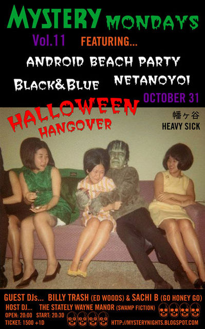 10月31日(月)幡ヶ谷ヘビーシック 〈LIVE〉 ANDROID BEACH PARTY BLACK & BLUE ねたのよい MACH5 〈DJ〉 BILLY TRASH (ED WOODS) SACHI B (GO HONEY GO) 〈HOST DJ〉 THE STATELY WAYNE MANOR 〈OPNE/START〉20:00/20:30 〈DOOR〉1,500yen+1D 東京都渋谷区西原2-27-4 B1 TEL: 03-3466-1445